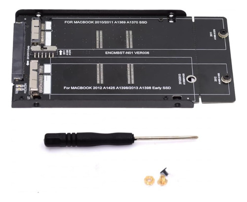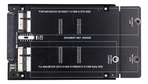 Adaptador de almacenamiento de MacBook a conexión SATA estándar, que proporciona un conector SATA de 22 pines (7 + 15) en la conexión al host y dos conectores de 12 + 6 pines y de 17 + 7 pines en las conexiones de dispositivos de almacenamiento SSD. Cuando se ensambla, puede funcionar en una variedad de sistemas operativos.